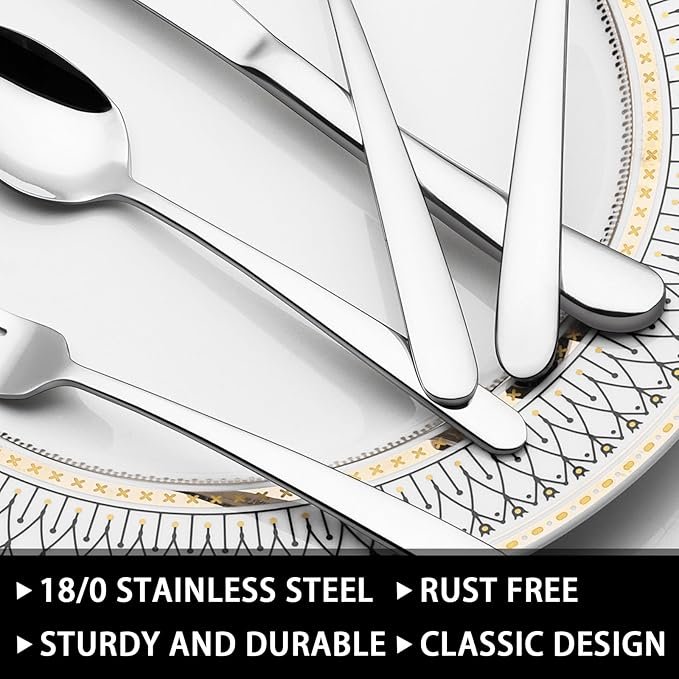 - 【COMFORTABLE DESIGN】: This flatware set has a classic silhouette with clean lines and polish-finish surface in all silver, a good choice to go with your existing tableware. The smooth edge of the handle is pleasure to hold, appropriate weight and perfect balance are added to ensure maximum comfort during use.