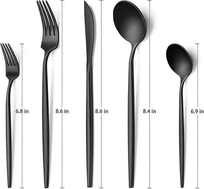 - PREMIUM 60-PIECE BLACK SILVERWARE SET FOR 12: This flatware set contains 12 dinner forks, 12 salad forks, 12 dinner spoons, 12 tea spoons, 12 dinner knives. It’s the ideal set for home daily use, and also for restaurants, pubs, cafes, and hotels. This cutlery set also help your dinner full of design while having a party.