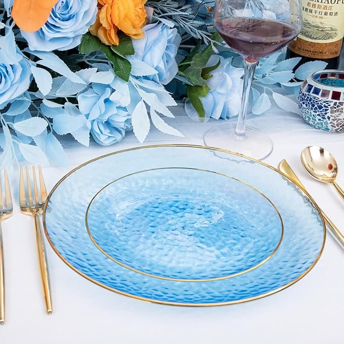 - Elegant and Fancy Design: These blue gold plastic plates with hammered design, the gold rims are perfect for adding a touch of sophistication to any event. The blue disposable with gold rim provide an upscale look, making the fancy plastic plates ideal for weddings, parties, and special occasions.