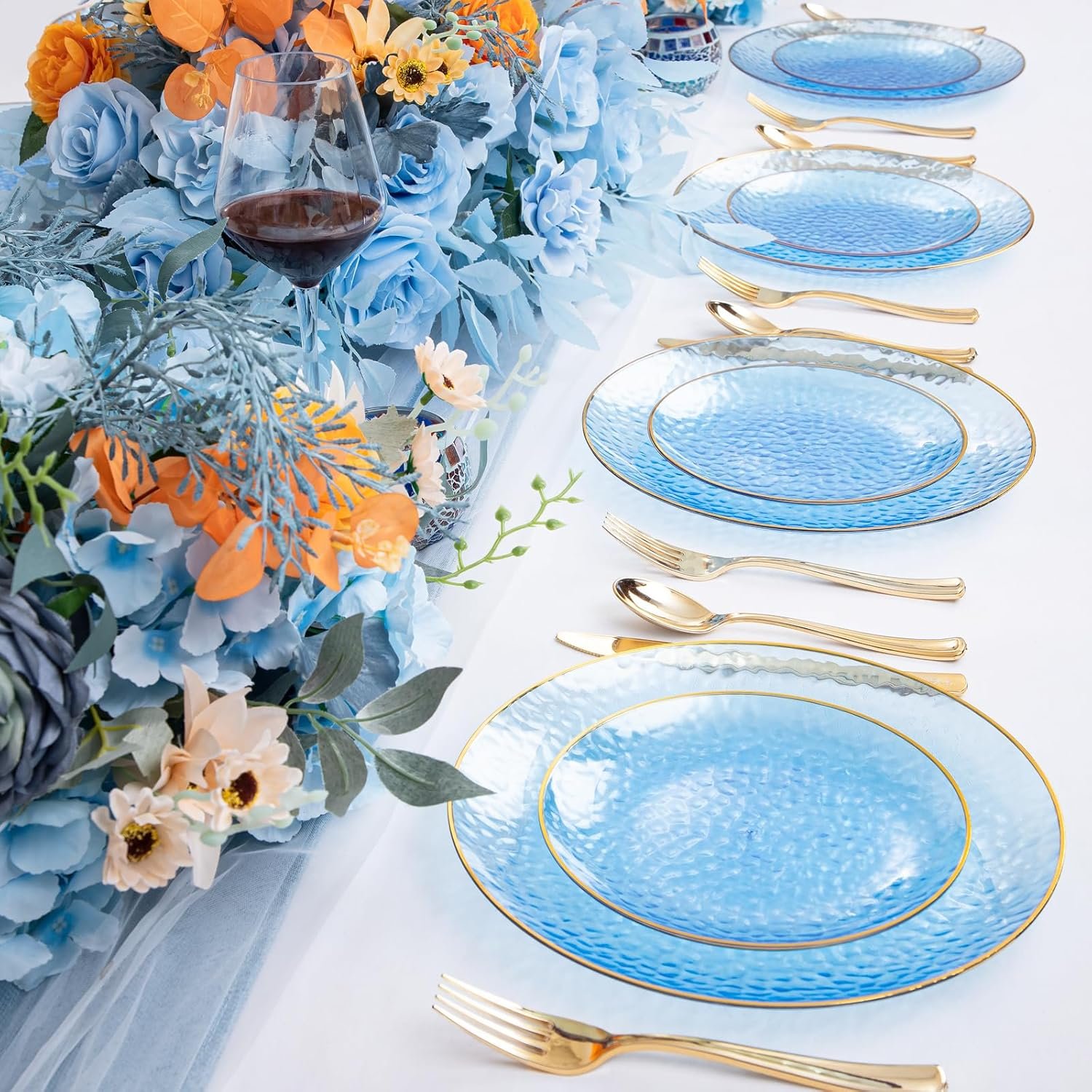 60Pcs Clear Blue Plastic Plates, Hammered Blue Plates, Clear Fancy Disposable Plates With Gold Rim Include 30 Dessert Plates, 30 Dinner Plates for Party
