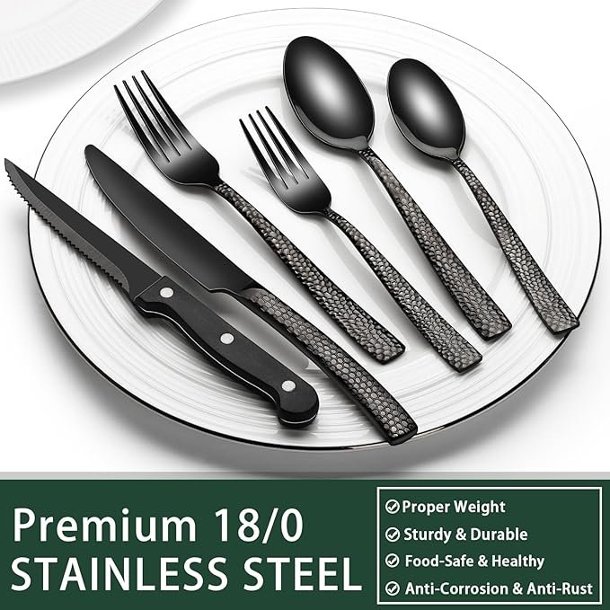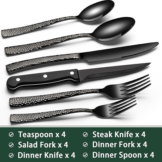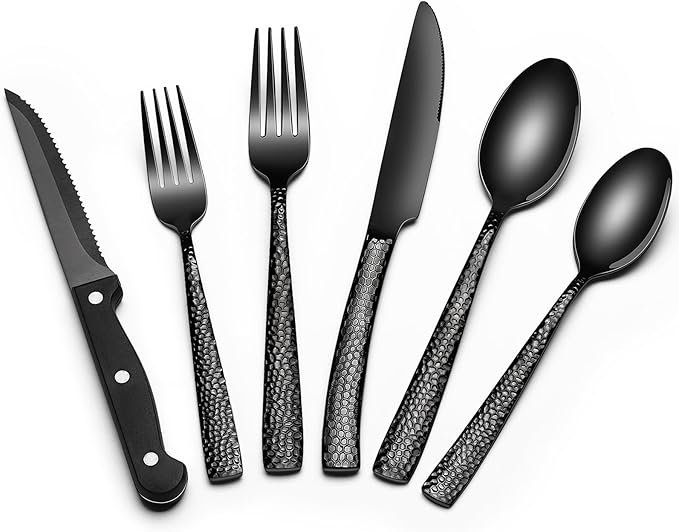 Black Hammered Silverware Set with Steak Knives, 24-Piece Stainless Steel Wave Flatware Set for 4, Food-Grade Tableware Cutlery Set, Utensil Sets for Home Restaurant, Mirror Finish, Dishwasher Safe
