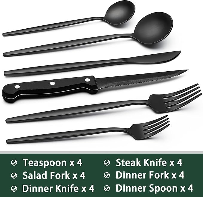 - PREMIUM 24-PIECE BLACK SILVERWARE SET FOR 4: This flatware set contains 4 dinner forks, 4 salad forks, 4 dinner spoons, 4 dessert spoons, 4 dinner knives and 4 steak knives. It’s the ideal set for home daily use, and also for restaurants, pubs, cafes, and hotels. This cutlery set also help your dinner full of design while having a party.