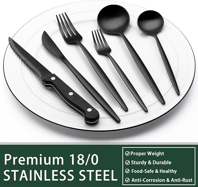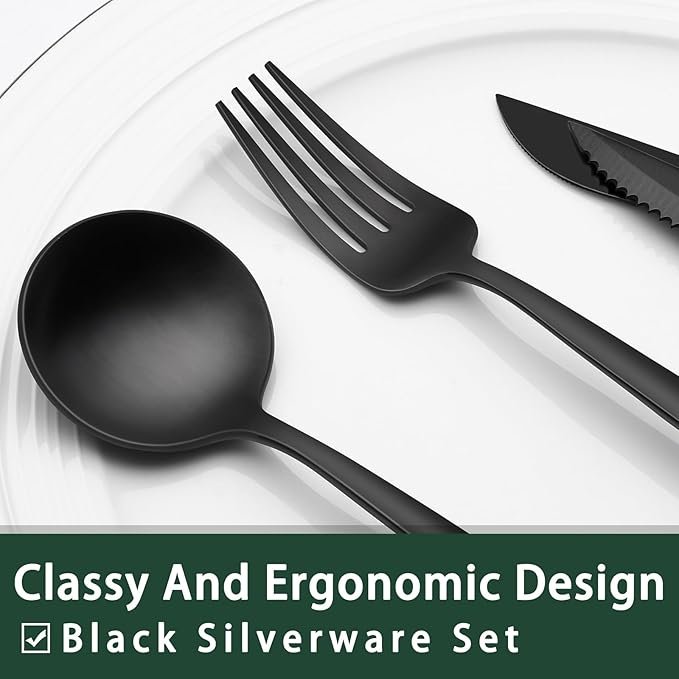 - COMFORTABLE DESIGN: This flatware set has a classic silhouette with clean lines and polish-finish surface in all black, a good choice to go with your existing tableware. The smooth edge of the handle is pleasure to hold, appropriate weight and perfect balance are added to ensure maximum comfort during use.