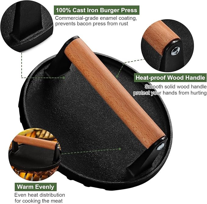 Burger Press, 7″ Round Heavy-Duty Cast Iron Smash Bacon Press Meat Steak with Wood Handle for Griddle, Sandwich, Nonstick Pan