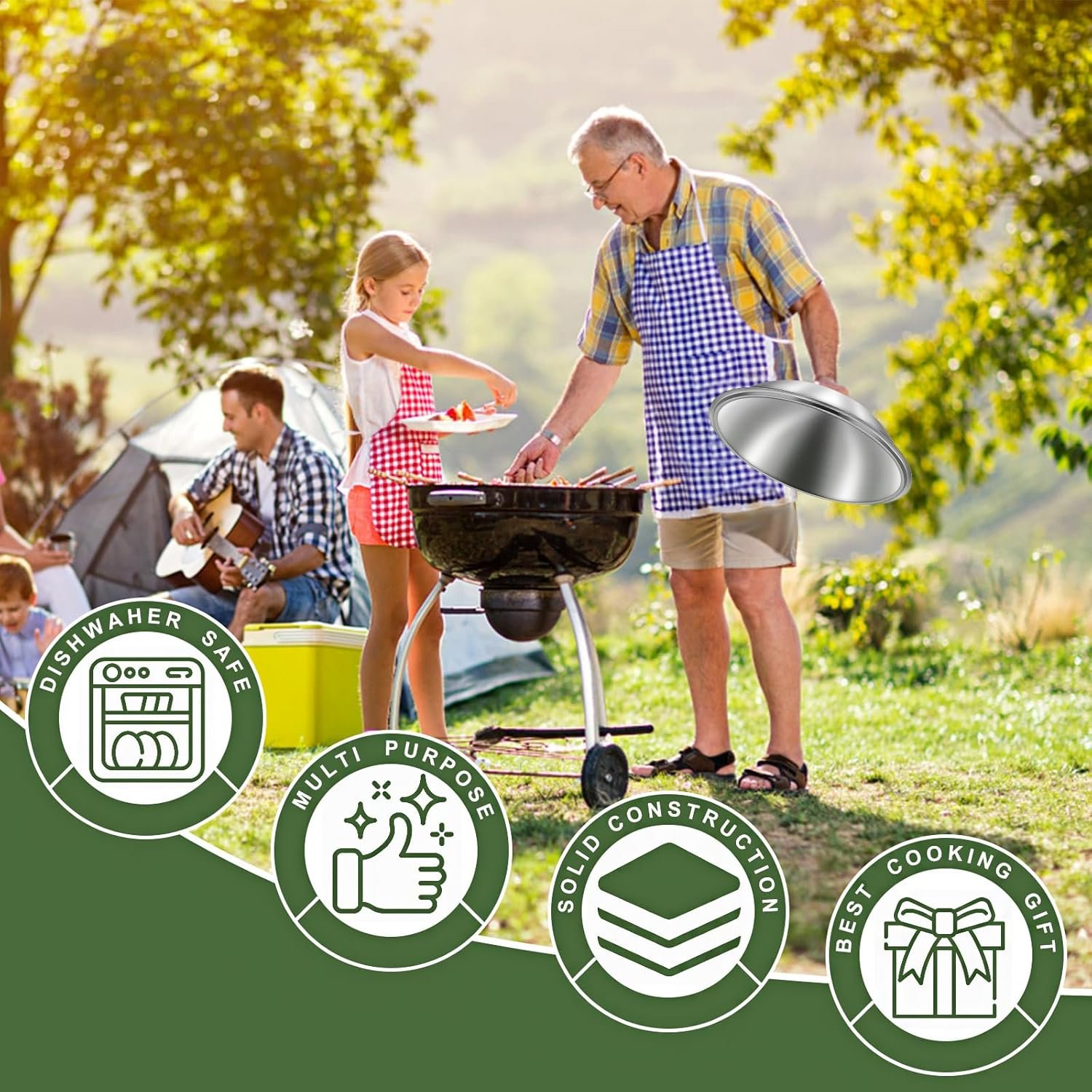 - [TOP QUALITY MELTING DOME]: The basting cover is 2.5mm thick 304 stainless steel and heavy duty, it’s durable and easy to clean. Round rolled rim makes steam flow back along it without overflow, Ergonomic plastic heatproof handle and dishwasher safe.