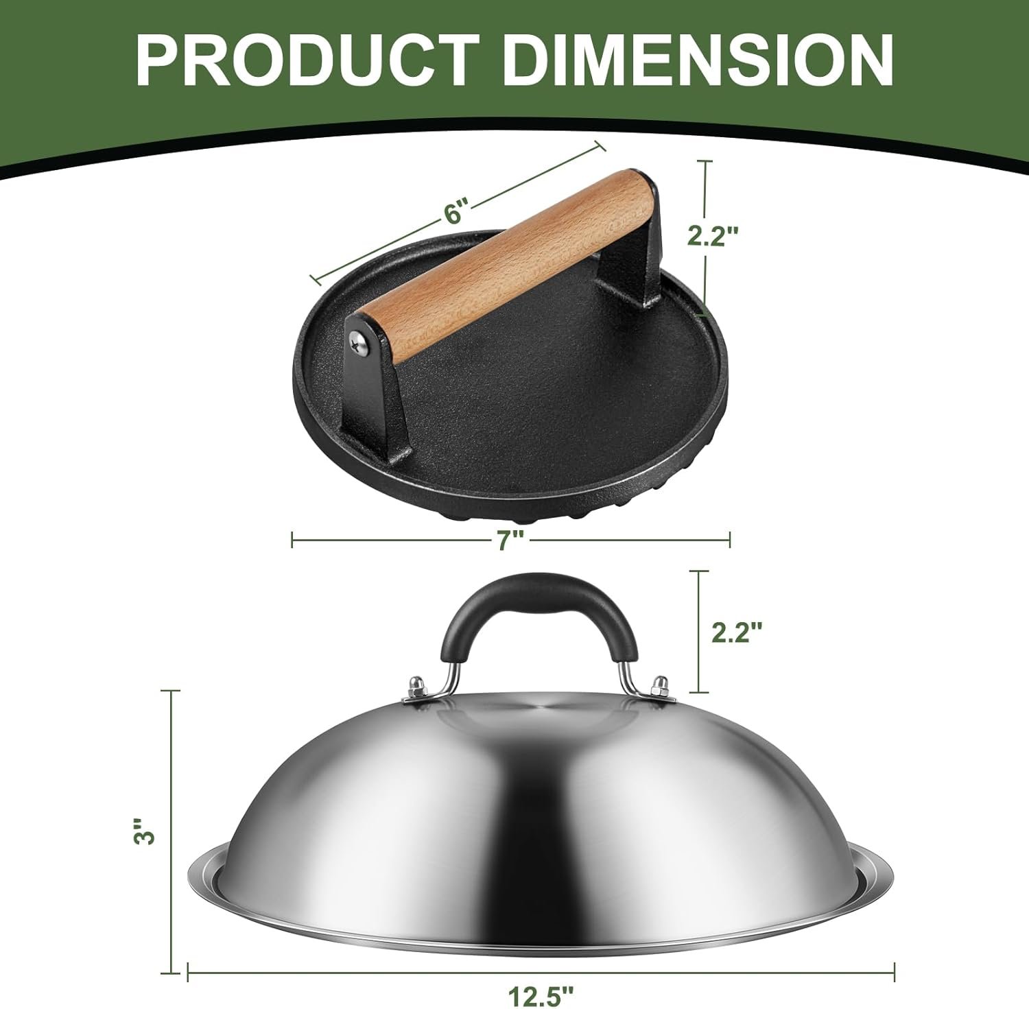 - [HEAT EVENLY & LARGE DIAMETER ]: 12.5” diameter melting dome and 7 inch diameter griddle press, create a larger coverage area of multiple hamburger patties or amount of veggies. The bacon press can be seasoned like cast-iron skillets to create a non-stick surface.